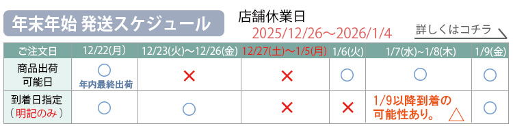 ※土日祝祭日は、発送業務・ご注文・お問合せ等の確認のご返信は翌営業日以降、順次させていただきますので、ご了承下さい。