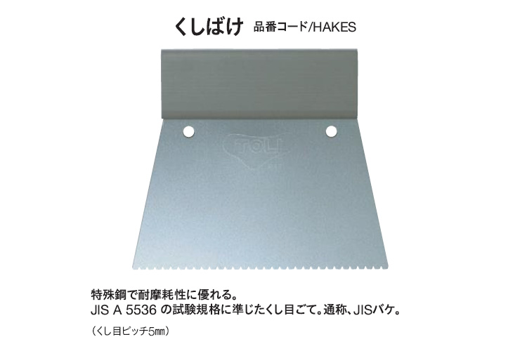 東リ くしばけ JISバケ HAKES<br>特殊鋼で耐摩耗性に優れる。JIS A 5536の試験規格に準じたくし目ごて。