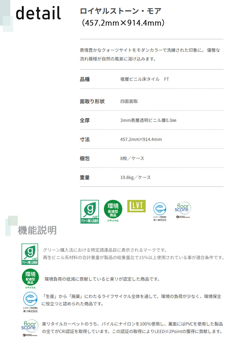 東リ ロイヤルストーン・モア(8枚) 複層ビニル床タイルFT 457.2mm×914.4mm <br>表情豊かなクォーツサイトをモダンカラーで洗練された印象に。優雅な流れ模様が自然の風景に溶け込みます。エコマーク認定商品。