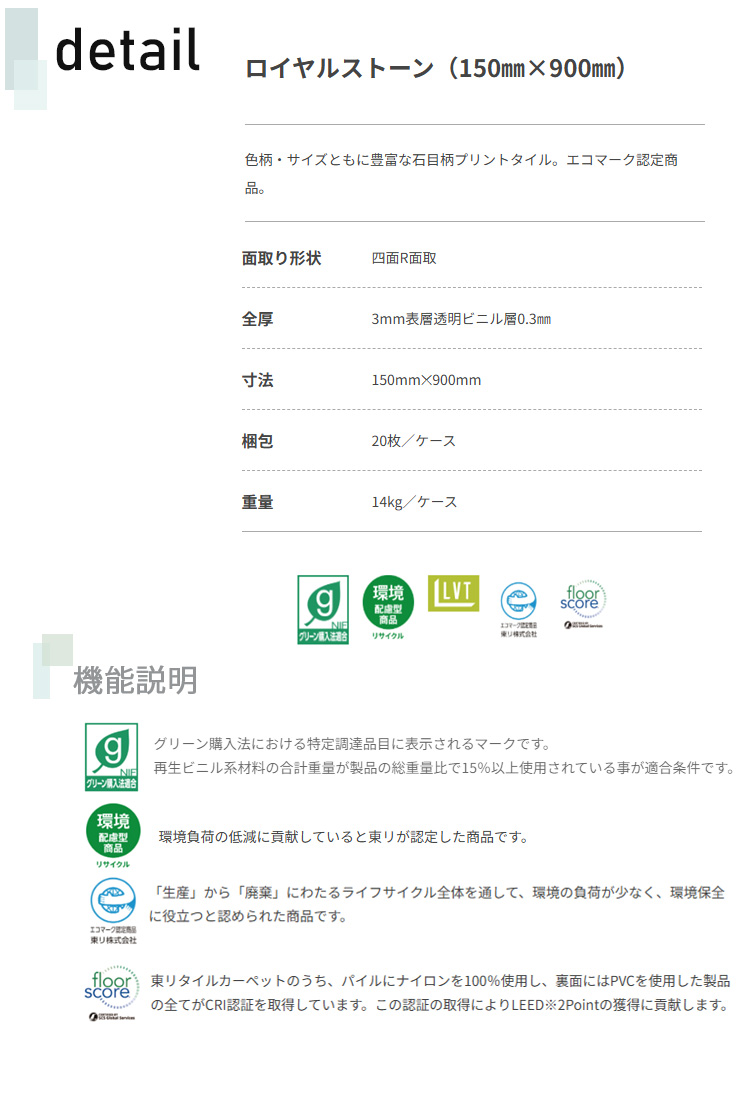 東リ 塩ビタイル ロイヤルストーン (150mm×900mm) ケース(20枚) FT 150mm×900mm<br>色柄サイズともに豊富な石目柄プリントタイル。エコマーク認定商品。