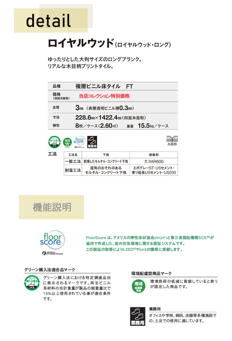 東リ 複層ビニル床タイルFT ロイヤルウッド ・ロング <br>ケース(8枚) 228.6mm×1422.4mm<br>ゆったりとした大判サイズのロングプランク。リアルな木目柄プリントタイル。