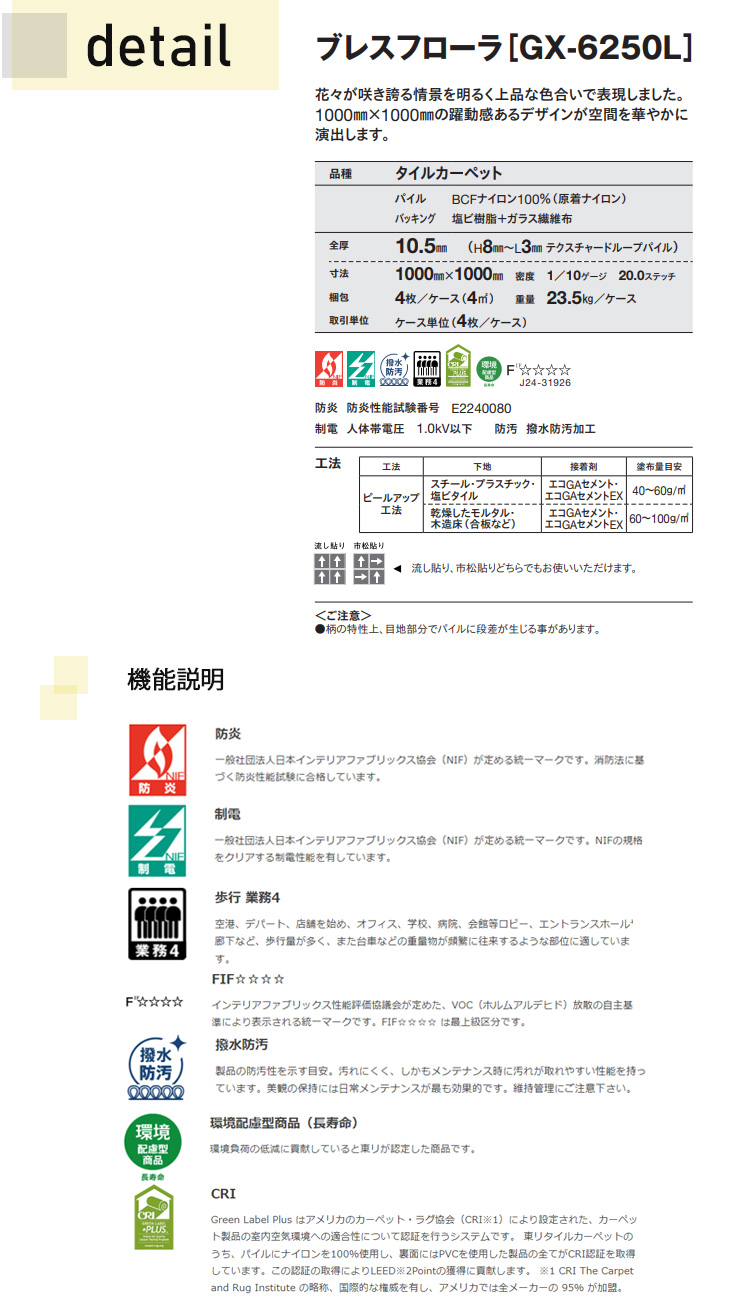 東リ タイルカーペット GX-6250L  100cm×100cm <br>花々が咲き誇る情景を明るく上品な色合いで表現しました。1000mm×1000mmの躍動感あるデザインが空間を華やかに演出します。 [戻る]