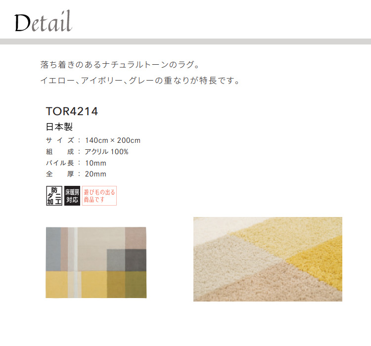 東リ ラグ TOR4214 140cm×200cm 落ち着きのあるナチュラルトーンのラグ。イエロー、アイボリー、グレーの重なりが特長です。 [tor4214]