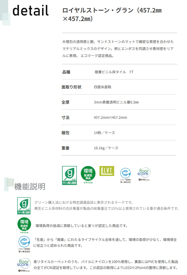 東リ ロイヤルストーン・グラン(457.2mm×457.2mm )ケース(14枚) 大理石の透明感と艶、サンドストーンのマットで緻密な質感を合わせたマテリアルミックスのデザイン。柄とエンボスを同調させ素材感をリアルに表現。 エコマーク認定商品。 [pstgran_457]