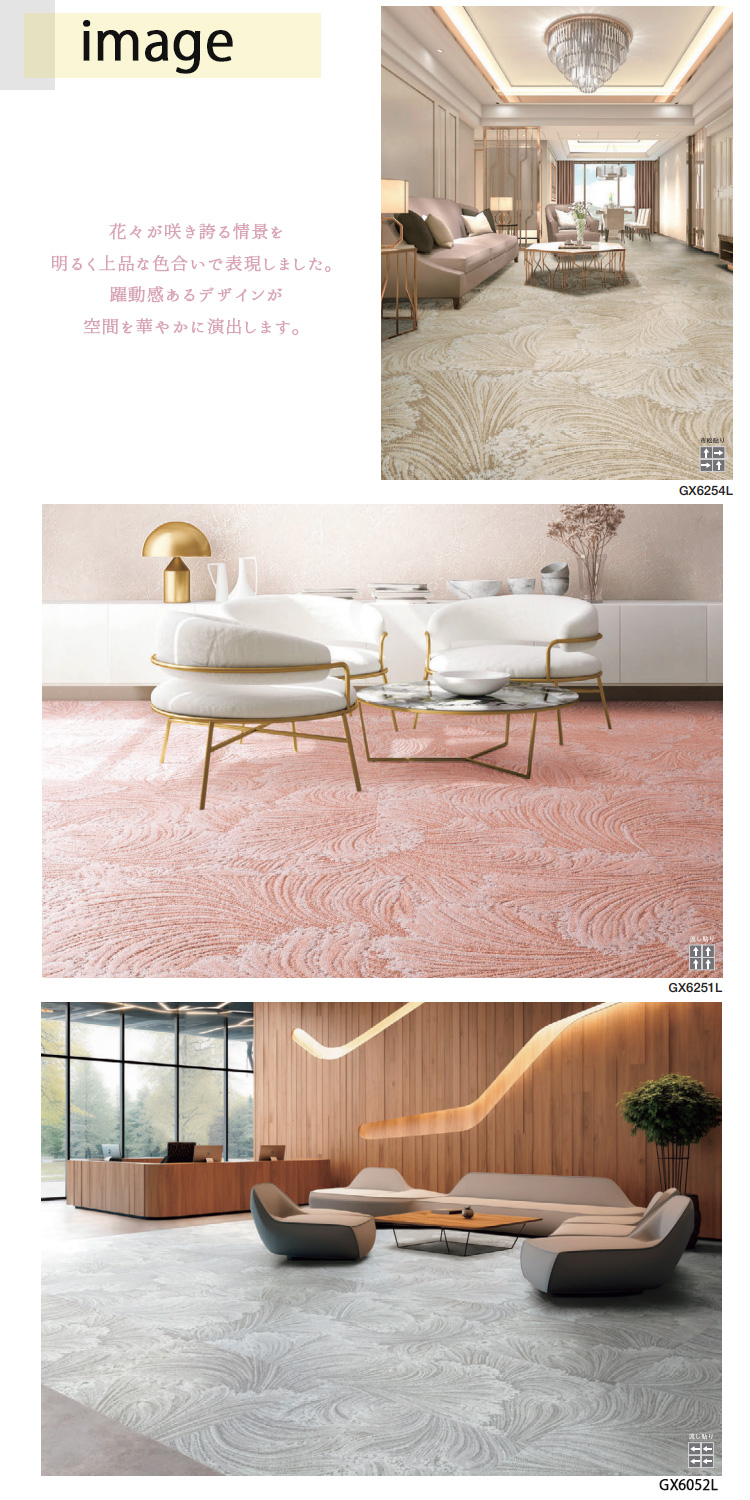 東リ タイルカーペット GX-6250L 100cm×100cm 花々が咲き誇る情景を明るく上品な色合いで表現しました。1000mm×1000mmの躍動感あるデザインが空間を華やかに演出します。 [gx6250-l]
