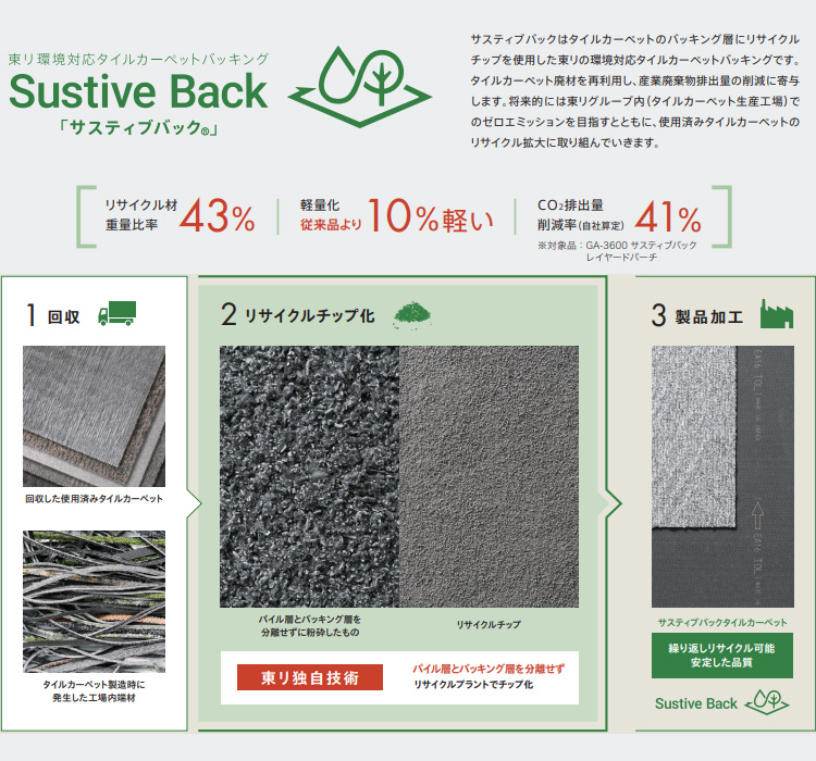 サスティブバックは、タイルカーペットのバッキングの一部にリサイクルチップを使用した東リの環境対応タイルカーペットバッキングです。