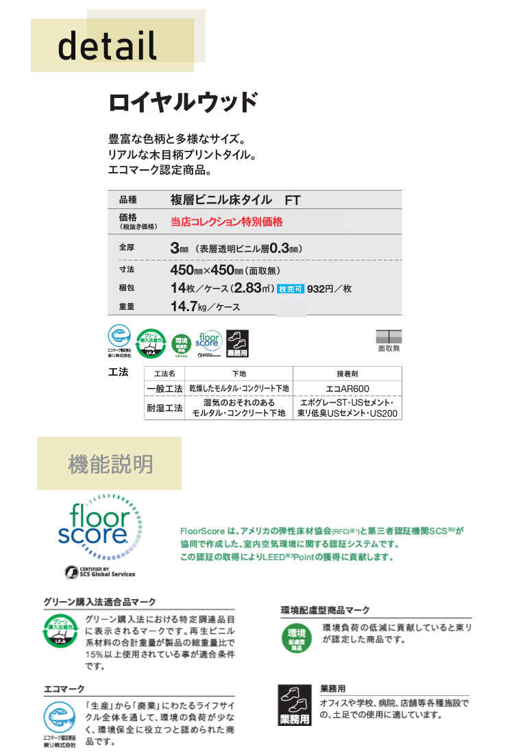 東リ 複層ビニル床タイルFT ロイヤルウッド (450mm角) ケース(14枚)450mm×450mm豊富な色柄と多様なサイズ。リアルな木目柄プリントタイル。エコマーク認定商品。 [pwt4263_4309]