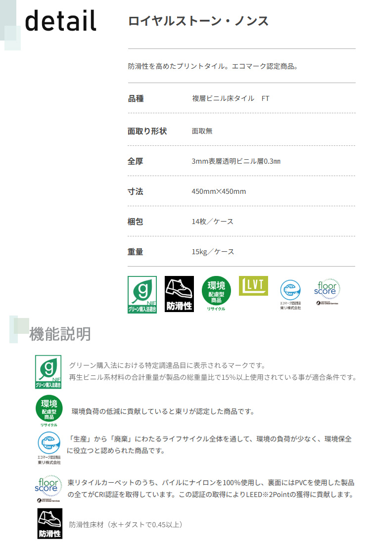 東リ ロイヤルストーン・ノンス (450mm角) ケース(14枚) 複層ビニル床タイルFT 450mm×450mm 防滑性を高めたプリントタイル。エコマーク認定商品。 [PST3181-3183]